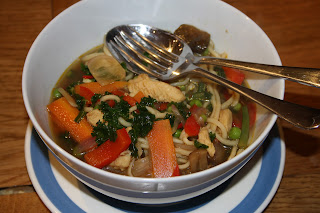 OK Victim nearly had a soup refusal today - and then admitted having soup for lunch too (smoked haddock chowder). So, I had to persuade with one of current favourites... well-ish... it could have been more chinese, but it was declared "yum" when every last drop was gone. So, sautee onion, ginger and garlic in peanut oil, add chopped chicken breast - then toss in chopped carrot, red pepper, green beans, mushrooms, radish and chili. Add about 2 pints of chicken stock and liberal splashings of soy sauce and rice wine. When veg is almost done add egg noodles, simmer for a minute add handful of frozen peas, sprinkle of chili flakes and good squeeze of lime, simmer then add handful of chopped kale. Tasty, hot and sour, clean tasting and nutritious. Victim declared yum.